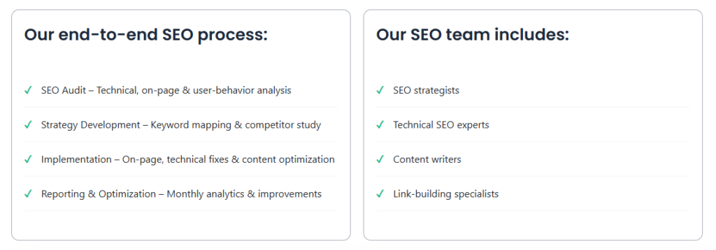 | SEO & Optimization | On-page SEO, keyword targeting, and link building | Higher visibility and organic traffic |